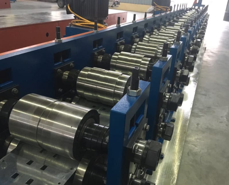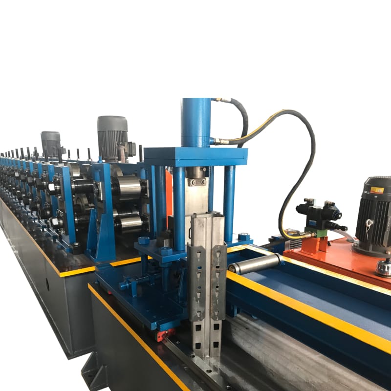 在生產(chǎn)過程中,對孔和槽進行沖壓,以便將負載梁安裝到立式機架中。該套貨架立柱系統(tǒng)設(shè)備包含整套立柱生產(chǎn)線,包括開卷機、液壓沖孔機、貨架立柱成型機、收料臺等部分,可以通過參數(shù)設(shè)置,生產(chǎn)不同尺寸的貨架立柱。