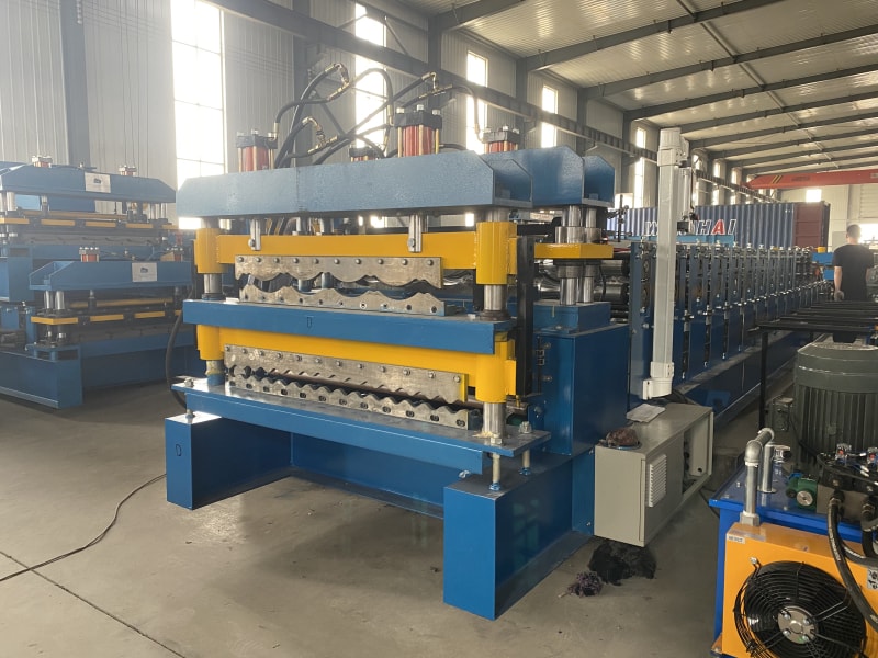 雙層金屬屋面瓦成型機(jī)主要用于生產(chǎn)金屬屋面瓦,一臺(tái)機(jī)器可以生產(chǎn)兩種不同的屋面瓦,機(jī)器是根據(jù)客戶想生產(chǎn)的屋面瓦類型定制的。